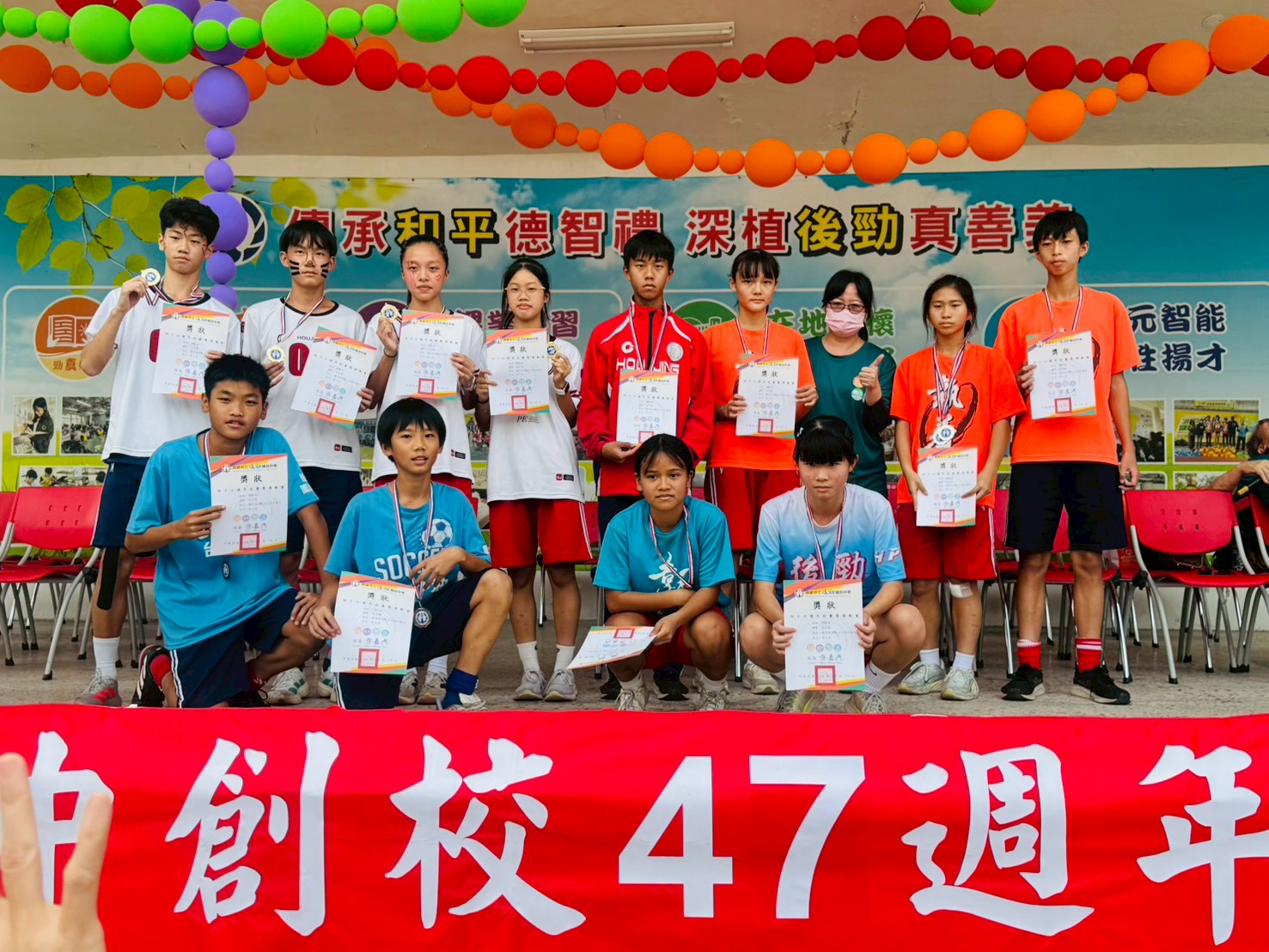 後勁國中47週年校慶,宣示代表由本校男足隊長蔣易峻、女足隊長廖品畇,我們感到非常光榮,足球隊的孩子學習各項工作承擔、責任,在後勁國中的校園中,處處充滿活力、笑聲。